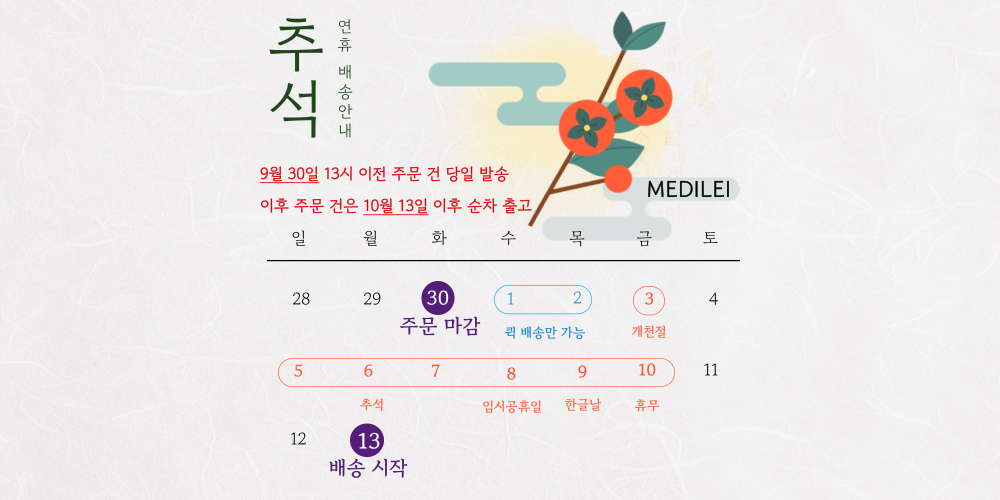 추석 연휴 기간 동안 주문 및 배송 일정을 아래와 같이 안내드립니다.